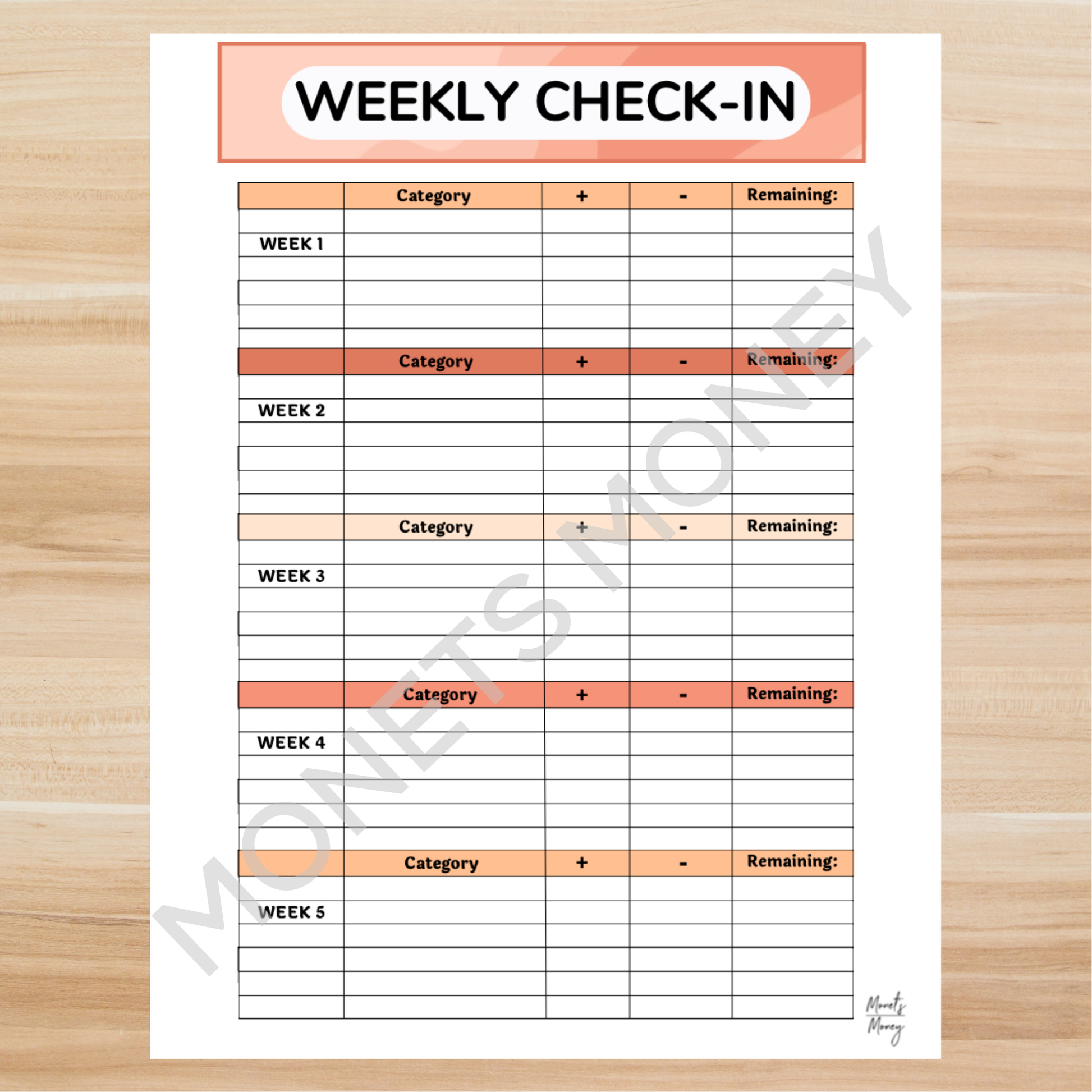 This Kit Includes 7 PDF worksheets: Calendar, Monthly Budget, Weekly Check-In, Expense Tracker, Paycheck Budget, Debt Tracker, Sinking Funds Tracker